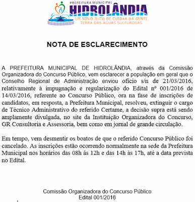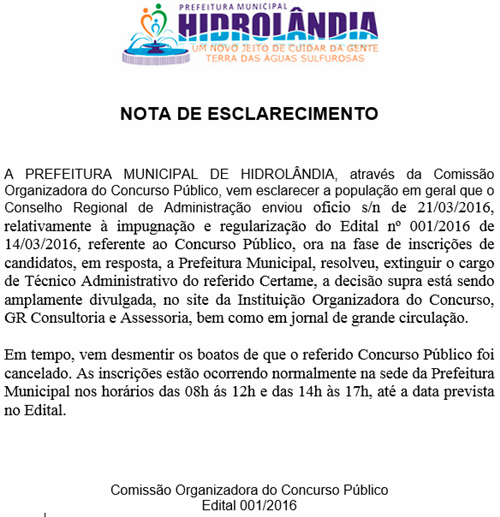 Prefeitura de Hidrolândia desmente cancelamento de Concurso Público