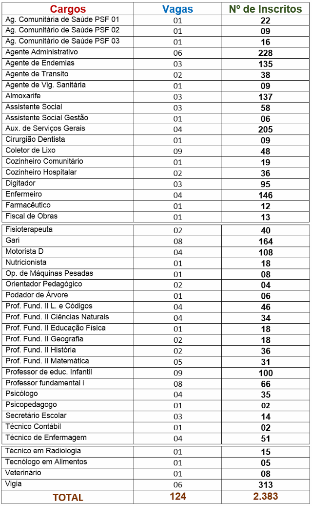 Os cargos de auxiliar de serviços gerais, vigia, almoxarife, agente administrativo e enfermeiro foram o mais disputado pelos candidatos inscritos. Já os de psicopedagogo, técnico contábil e orientador pedagógico foram os que obtiveram a menor quantidade de inscrições.