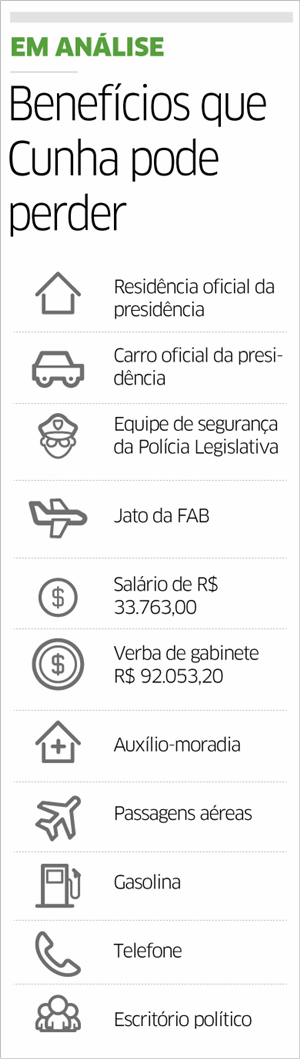 Com isso, Cunha perderá o veículo oficial, ouso de jatos da Força Aérea Brasileira (FAB), a equipe de segurança da Polícia Legislativa e toda a estrutura do gabinete oficial da presidência da Casa. Os funcionários do gabinete pessoal também serão exonerados. Com a leitura da decisão do STF, prevista para esta sexta-feira (6), o deputado afastado terá30 dias para deixar a residência oficial em Brasília.