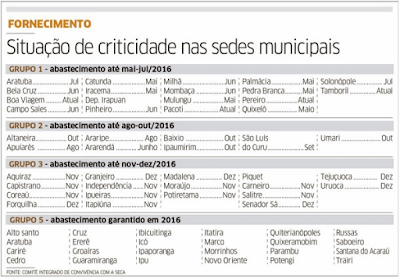 Os municípios foram divididos em três categorias de criticidade de abastecimento, conforme o período em que os sistemas de oferta de água à população devem entrar em colapso. O grupo um reúne 17 cidades que enfrentam crise atual até julho próximo. São elas: Aratuba, Bela Cruz, Boa Viagem, Campos Sales, Catunda, Deputado Irapuan Pinheiro, Iracema, Milhã, Mombaça, Mulungu, Pacoti, Palmácia, Pedra Branca, Pereiro, Quixelô, Solonópole e Tamboril.