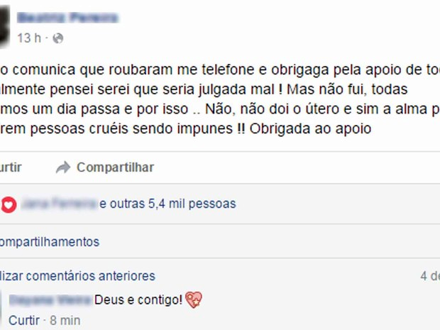 Antes, ainda na noite da quinta-feira (26), ela já havia agradecido a solidariedade recebida e revelou que temia ser mal vista pelo episódio. “Venho comunicar que roubaram meu telefone e obrigada pelo apoio de todos. Realmente pensei que seria julgada mal”, disse. Segundo ela, 33 homens portando armas participaram do crime.