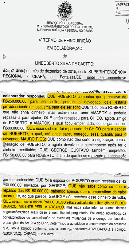Outra negociação que foi declinada por Lindoberto durante o depoimento diz respeito a Paulo Diego da Silva Araújo. O traficante, que também seria um dos líderes do PCC no Ceará, estaria articulando com advogados a soltura de três presos por meio de compra de liminares.