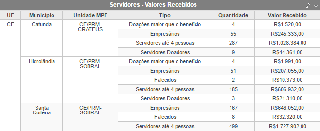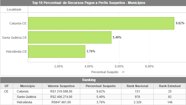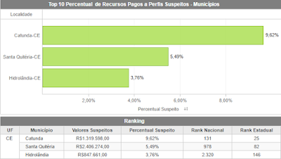 Também levantamos nos municípios de Santa Quitéria, Catunda e Hidrolândia, os valores totais pagos no período a estes Perfis Suspeitos, bem como a classificação no ranking estadual.
