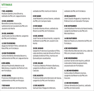 O caso desta terça-feira aumenta a lista de policiais vítimas de homicídio no Ceará neste ano. De janeiro até hoje, 25 agentes de segurança já foram assassinados, o que supera os 15 registros do ano passado. Na maioria dos casos, os policiais estavam de folga e à paisana quando acabaram assassinados por criminosos.
