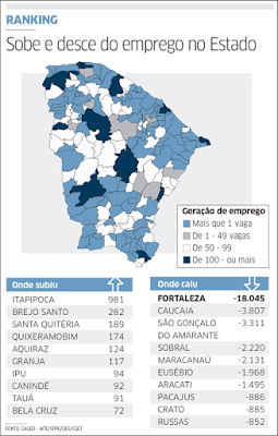 "No caso de Itapipoca, por exemplo, o crescimento foi puxado pela indústria da transformação", pontua. Entre os que ampliaram o estoque de assalariados, ele destaca municípios do litoral oeste, da zona norte, da região dos Inhamúns e da Região Metropolitana do Cariri (RMC). O coordenador pondera, entretanto, que metade das cidades cearenses apresentaram resultados negativos. "Apenas 13 municípios, em todo o Estado, geraram mais de 100 postos de trabalho em todo o ano".