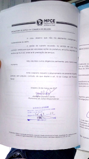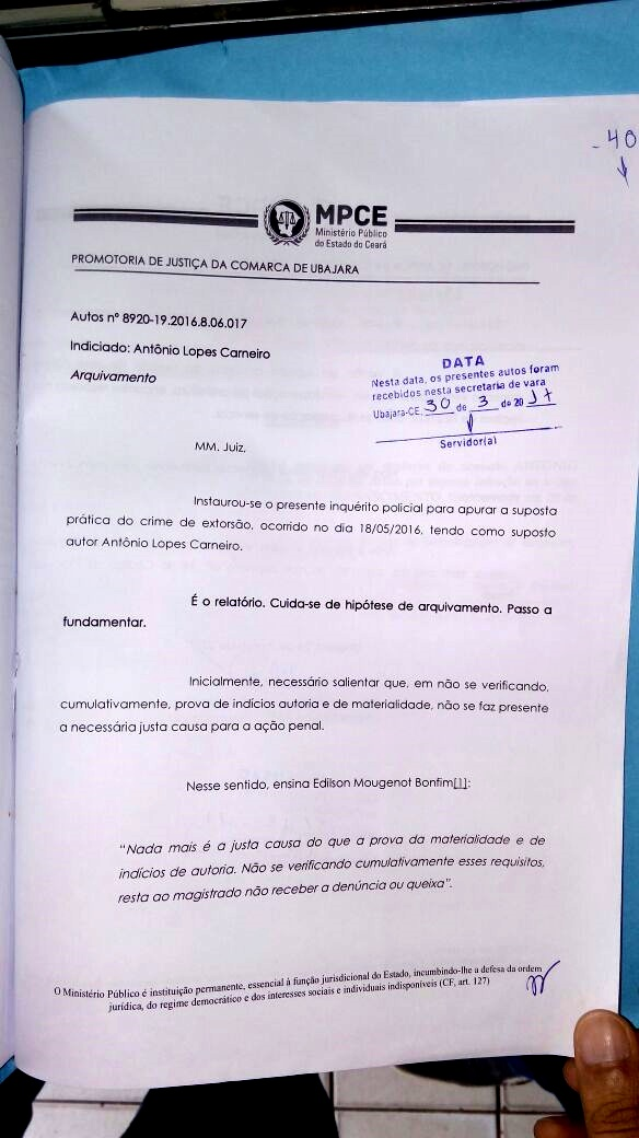 No final do ano passado, eu e Dr. Fábio, juntamos provas e fizemos um Habeas Corpus Preventivo, pedindo o arquivamento do inquérito policial e encaminhamos para o fórum local. O Juiz pediu vista do Ministério Público de Ubajara que analisou e afirmou que a minha versão de que houve contrato verbal, está respaldado nos recibos de prestação de serviço publicitário, requerendo arquivamento do inquérito policial.