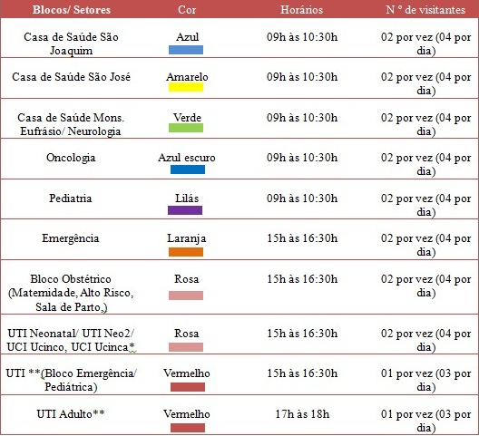 * As visitas na UTI Neonatal/ Neo 2/UCI Ucinco, UCI Ucinca, ocorrerão na segunda e sexta-feira no horário de 15h às 16:30h.