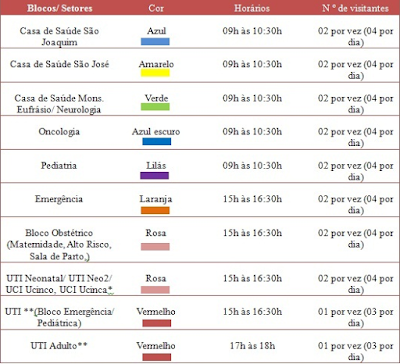 Com as mudanças, os horários de visitas aos setores ficarão restritos a um turno. Os setores serão classificados por cores e a recepção do visitante será feita por dois funcionários que identificarão o paciente a ser visitado. Depois disso, será autorizada a entrada do visitante, mediante a apresentação de um documento com foto. Neste momento, será entregue um crachá com identificação do setor do paciente para a visita, no período de uma hora e trinta minutos entre a chegada e a saída do visitante.