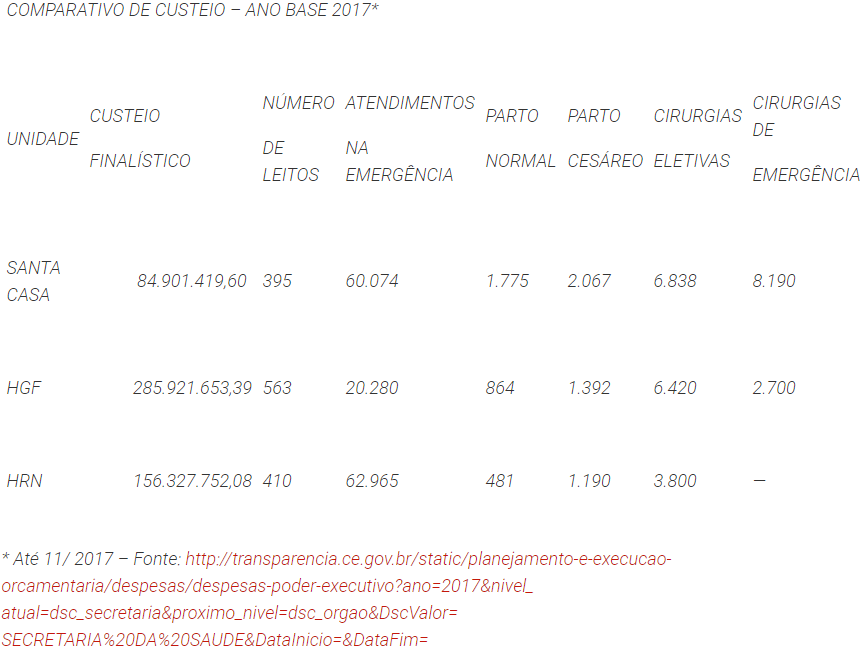 2.400 sessões de Terapia Renal Substitutiva (pacientes com Doença Renal Aguda).Importante destacar que para funcionar a Santa Casa de Misericórdia de Sobral depende quase que exclusivamente de recursos oriundos do SUS (a partir da pactuação com Sobral e mais 54 municípios da macrorregião), repassados mensalmente pelo Ministério da Saúde ao Fundo Municipal de Saúde de Sobral, a quem compete transferir esses recursos ao hospital, mediante auditoria realizada em prontuários (AIH) para atestar a realização dos procedimentos.De fato, em atenção à Portaria Nº 3.410, de 30 de dezembro de 2013, que estabelece as diretrizes para a contratualização de hospitais no âmbito do Sistema Único de Saúde (SUS), em consonância com a Política Nacional de Atenção Hospitalar (PNHOSP), a Santa Casa de Misericórdia de Sobral e a Secretaria de Saúde de Sobral celebram um convênio anualmente, denominado contratualização, mediante um Plano Operativo, contendo metas, indicadores, valores de repasse e instrumento de acompanhamento/fiscalização.Neste ano de 2017 o valor da contratualização corresponde a R$ 93.900.602,42, cujo repasse mensal está criteriosamente vinculado a auditoria dos prontuários (AIH) e ao parecer da Comissão de Acompanhamento do Convênio (composta por representantes da Secretaria da Saúde de Sobral, Instituições de Ensino Superior e Conselho Municipal de Saúde) que verifica, além da Assistência ao paciente (AIH), a Gestão Hospitalar, o Ensino/Pesquisa e a Avaliação dos usuários.É também importante saber que o recurso repassado pelo Ministério da Saúde ao Hospital é calculado com base na população de Sobral e dos demais 54 municípios que compõem a Macrorregião de Saúde de Sobral. Esse recurso está muito defasado. Na verdade, não tem reajuste pelo Ministério da Saúde desde 2011. Neste contexto, o hospital vem atendendo a uma demanda crescente de pacientes que a cada dia aqui chegam a procura de tratamento.Enfrentar as dificuldades, que em sua maioria são fruto do subfinanciamento, exige de todos nós esforços para melhorar a assistência prestada aos pacientes, principalmente nos setores do hospital onde a demanda extrapola nossa capacidade de atendimento, como a Emergência e a Maternidade.Para que se tenha uma real dimensão da discrepância entre financiamento e capacidade de assistência, observemos o quadro comparativo abaixo, onde são apresentados indicadores do ano de 2017 da Santa Casa de Misericórdia de Sobral, do Hospital Geral de Fortaleza e do Hospital Regional Norte. Os dois últimos mantidos pelo Governo do Estado do Ceará. Não é difícil perceber que entre os três hospitais a Santa Casa é a que dispõe de menos recursos, ainda assim apresenta capacidade de resolução superior. Ou seja, faz mais e custa bem menos.