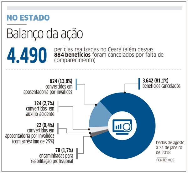 Desde agosto do ano passado até 31 de janeiro, foram realizadas 4.490 perícias no Ceará, que resultaram em 3.642 benefícios cancelados (81,1%). Além desses, outros 884 também foram suspensos por falta de comparecimento dos beneficiários - todos que receberem a carta de convocação do governo devem entrar em contato com o INSS pelo número 135 em até cinco dias corridos (exceto domingo) e agendar a perícia.