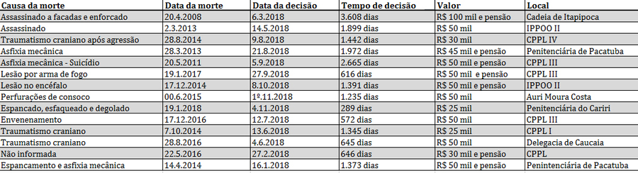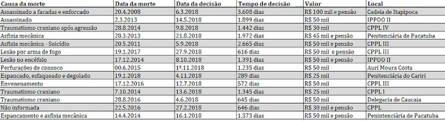 É justamente essa demora que afasta familiares das vítimas na busca por reparação judicial, segundo o defensor público Igor Barreto de Menezes Pereira. Ele é autor de ação civil pública contra o Estado pelas mortes de dez internos da Cadeia Pública de Itapajé, a 130 km de Fortaleza, em 29 de janeiro. Paralelamente, todas as famílias dos mortos à época também impetraram processos indenizatórios pela matança.