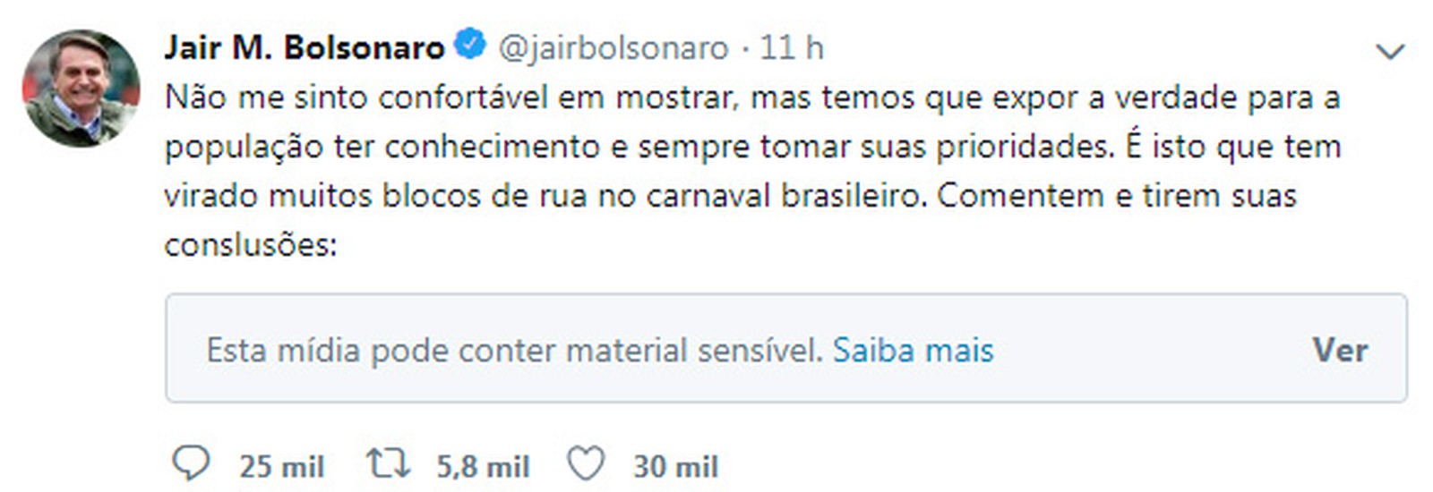 O presidente tuitou: "Não me sinto confortável em mostrar, mas temos que expor a verdade para a população ter conhecimento e sempre tomar suas prioridades. É isto que tem virado muitos blocos de rua no carnaval brasileiro. Comentem e tirem suas conslusões (sic)", escreveu o presidente. A polêmica cena foi gravada no desfile do Blocu, em São Paulo, na segunda-feira (4).