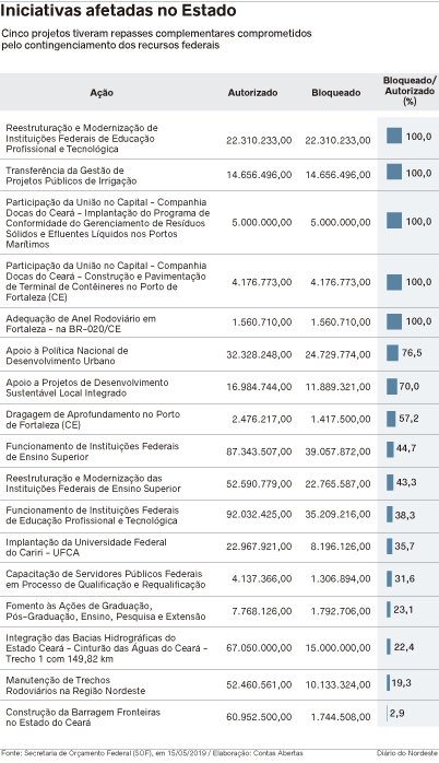 Para as 17 ações previstas para o Ceará, foram autorizados R$ 546,7 milhões, dos quais 40,4% (R$ 220,9 milhões) estão bloqueados. No Brasil, o contingenciamento de R$ 30 bilhões, anunciado em março, congelou mais de 40% de aproximadamente 450 projetos. E, com a piora da economia, a expectativa é de que seja anunciado novo bloqueio estimado em R$ 5 bilhões, quando o Governo divulgar o relatório com as previsões de receitas e despesas deste ano.