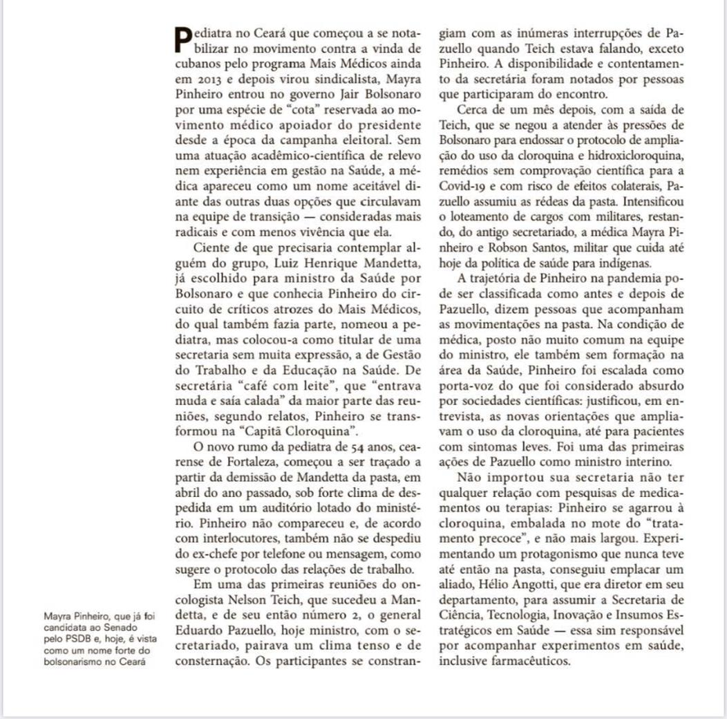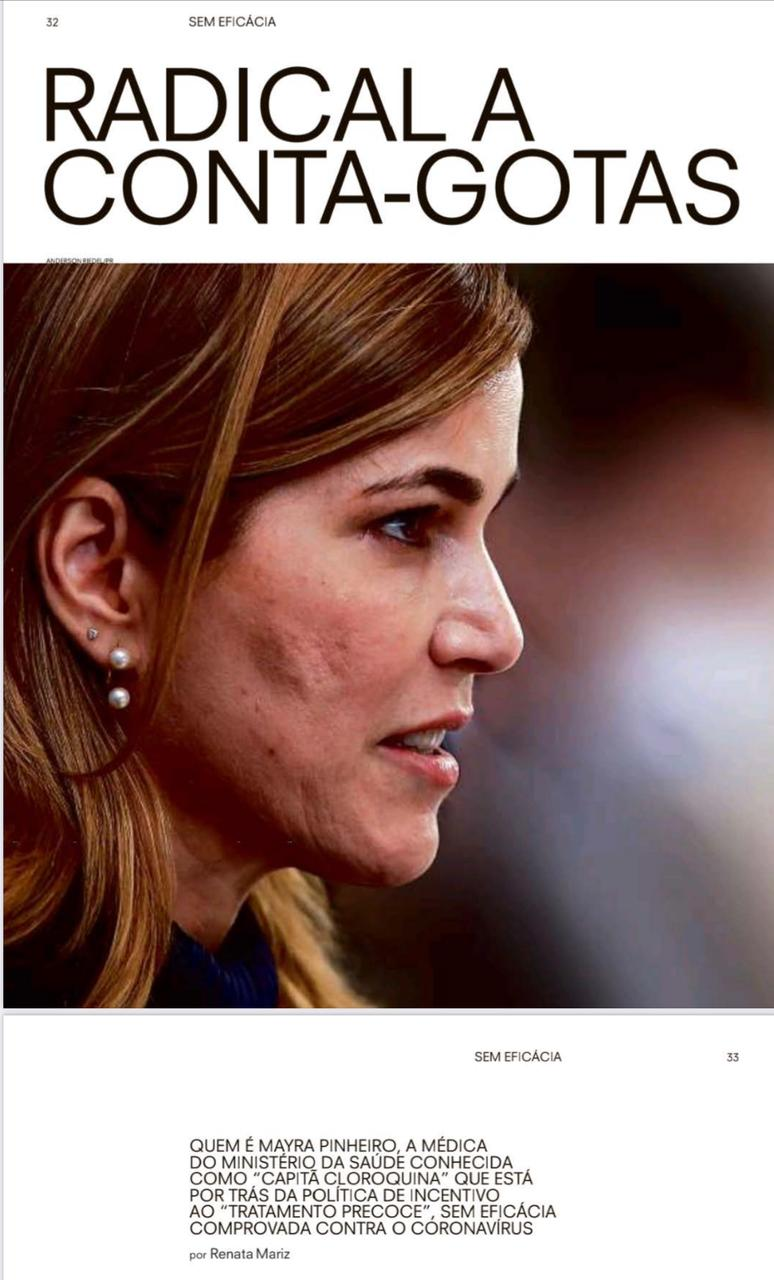 A matéria relata que a médica, conhecida como “Capitã Cloroquina”, está por trás da política de incentivo ao ‘tratamento precoce’, sem eficácia comprovada contra o Coronavírus.