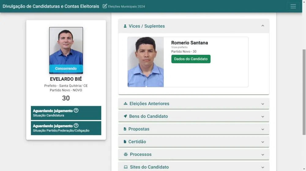 O professor Evelardo Bié (NOVO) registrou sua candidatura à prefeito de Santa Quitéria nesta quinta-feira (08/08) e declarou patrimônio de R$ 1.151.248,12 à Justiça Eleitoral. Seu vice, Romério Santana, informou ter R$ 12 mil em bens.