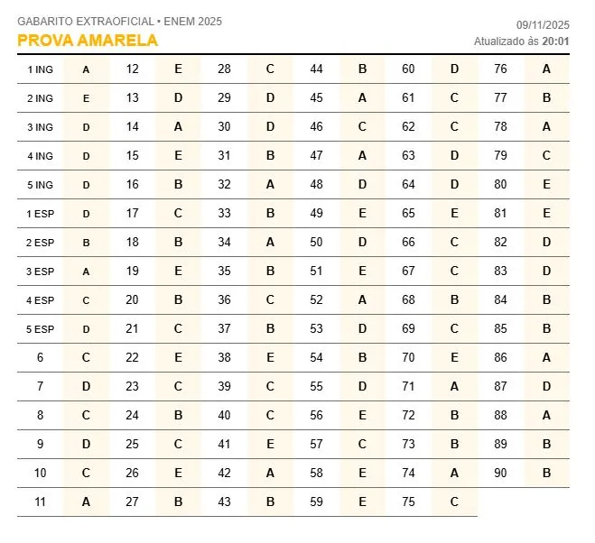 O gabarito do Enem 2025 só é divulgado pelo Inep em dezembro. Mas estudantes podem conferir o gabarito extraoficial elaborado por professores convidados.